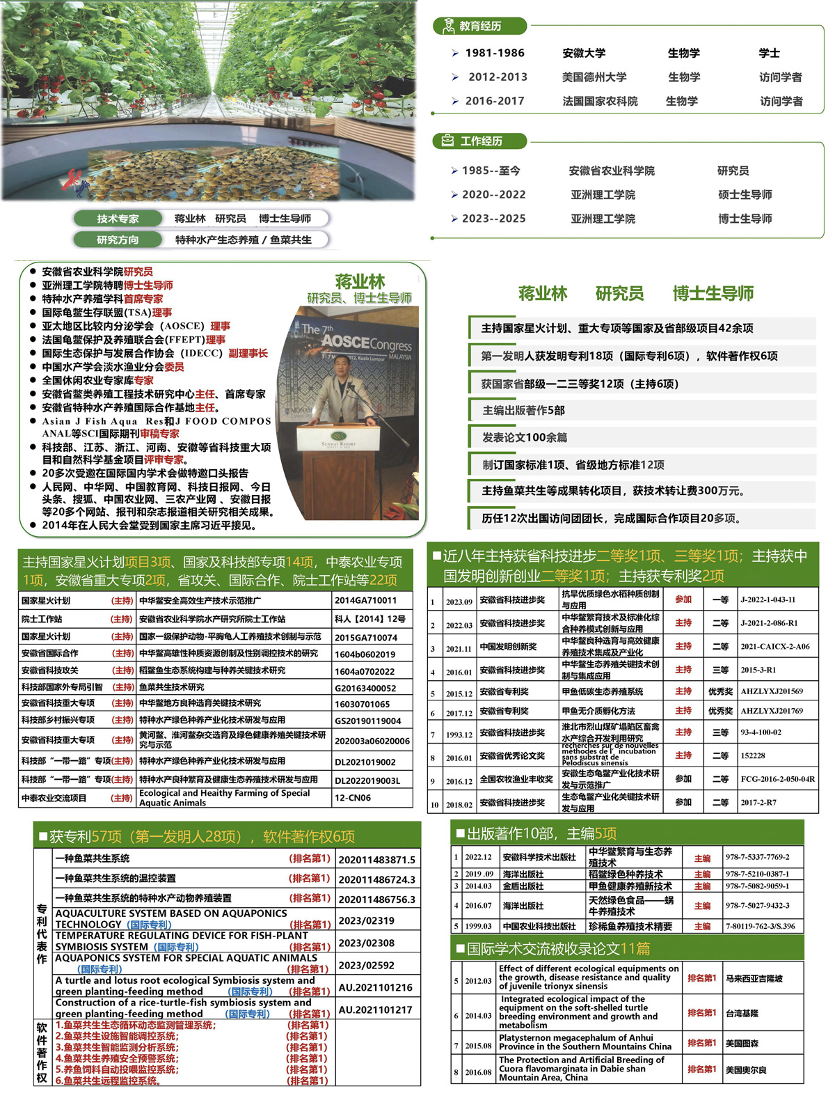 蒋业林(1963-), 研究员,安徽舒城。 1985年四月在安徽大学加入中国共产党,同年7月毕业于安徽大学生物系动物学专业,大学本科,获理学学士,博士生导师。2012-2013年在美国学习深造,历任12次科技出国访问团团长,多次为访问学者赴美、法、马、台、越等国家和地区。现为国际亚洲和大洋洲比较内分泌学会会员“Asia and Oceania Society for Comparative Endocrinology”(AOSCE)、国际龟鳖生存联盟“The Turtle Survival Alliance”(TSA)专家成员,法国龟鳖保护及养殖联合会“ Fédération Francophone pour l'Elevage et la Protection des Tortues ”(FFEPT)专家成员,国际生态保护与发展合作协会institute for development ecology conservation &cooperation(IDECC)专家成员,法国蜗牛推广协会“French Snail Promotion Association”(FSPA)专家成员,国际野生生物保护学会(WCS)专家成员、中国水产学会淡水渔业分会委员,全国休闲农业与乡村旅游专家库专家,安徽省特种水产养殖国合基地主任、安徽省中华鳖生态养殖引智示范基地主任、安徽省水产院士工作站站长,安徽省鳖类养殖工程技术研究中心主任、首席专家,中国动物学会比较内分泌学分会会员,安徽省政府咨询机构对外交流合作协会现代农业委员会委员、安徽省水产学会特种水产养殖专业委员会委员,安徽省国际科技合作协会会员,省科技厅科技特派员,安徽省龟鳖产业协会副秘书长。亚洲渔业与水产研究(Asian Journal of Fisheries and Aquatic Research)和(Journal of Food Composition and Analysis)等国际期刊审稿专家,广东海洋大学学报评审专家,江苏、浙江、河南、安徽等省科技重大项目和自然科学基金项目评审专家,CNKI库系统评审专家。长期以来,进行水产养殖技术研究和成果转化工作,出国培训和国际学术交流活动10余次,与美国德州A&M农工大学、马里兰大学、康奈尔大学和淡水研究中心,法国农科院、法国龟鳖保护联合会、以色列鱼类中央实验室、日本早稻田大学等相关专业机构达成了良好的合作机制,主持项目40余项;获授权专利48项,其中国际专利6项(均排名第1),中国发明专利16项(9项排名第1)、实用新型25项、外观设计1项);发表科研论文80余篇,出版著作11部(主编5部);获省科技进步一等奖1项、省科技进步二等奖2项(1项排名第1)、国家发明创业创新二等奖1项(排名第1)、农业部丰收二等奖1项、安徽省自然科学优秀学术论文二等奖1项(排名第1)、省三等奖7项(1项排名第1)、安徽省专利优秀奖2项(均排名第1)、市二等奖1项(排名第1)、市三等奖2项、县政府一等嘉奖1项;获科研成果16项;制修订国家标准1项、省级地方标准12项(7项排名第1)、企业标准4项。培训农民23500人次,全省累计示范推广面积60万亩,实现总产值82.5亿元,利润22.275亿元。